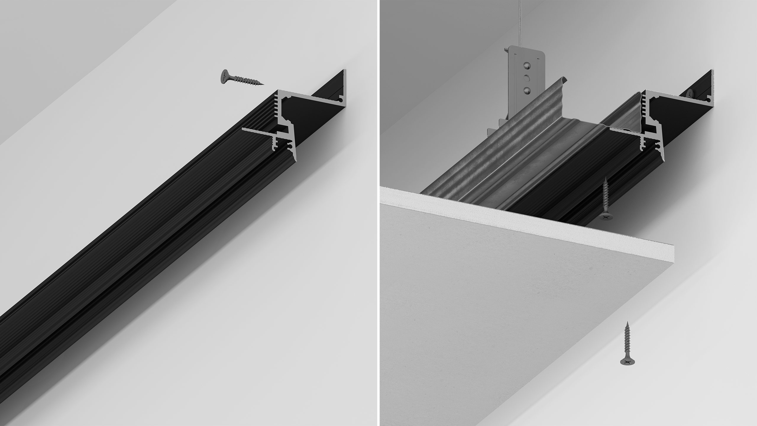 Recessed shadow profile with a 30 mm gap for installation into drywall.