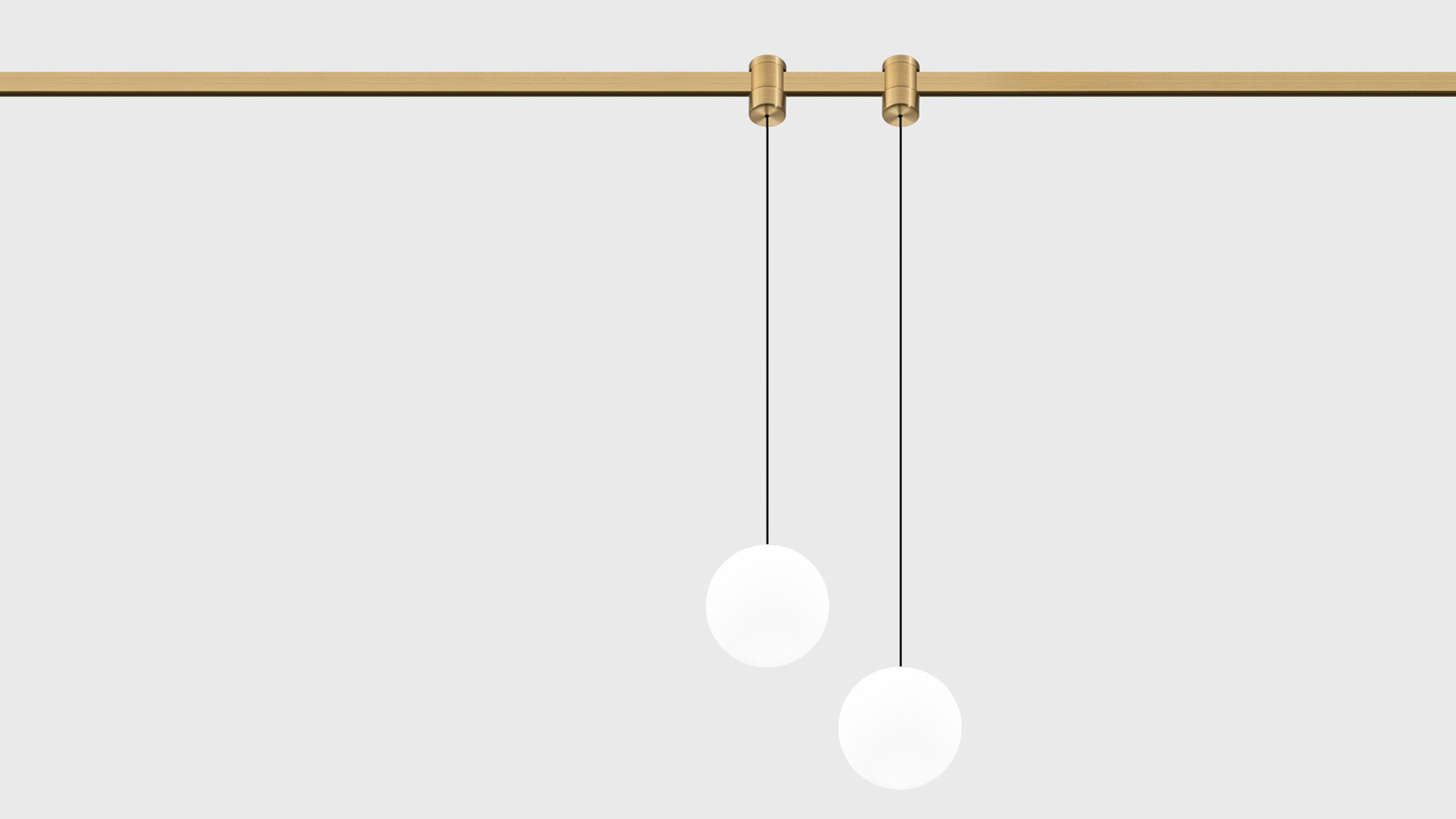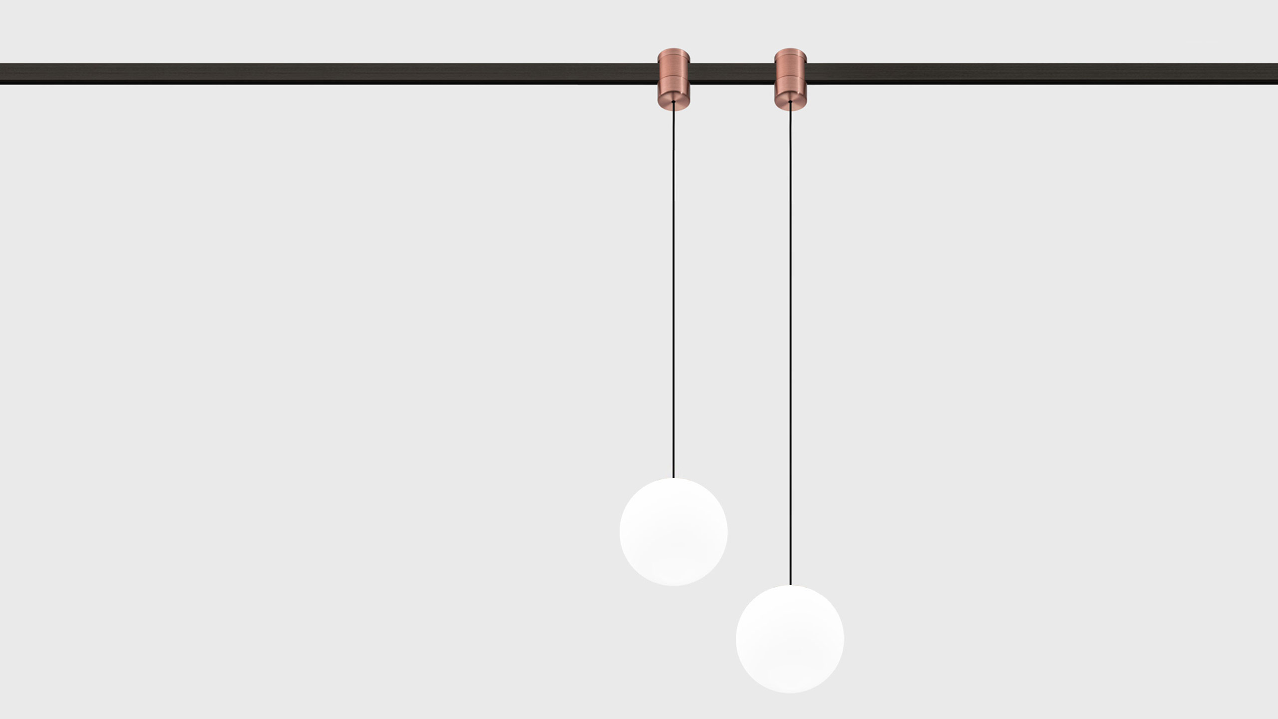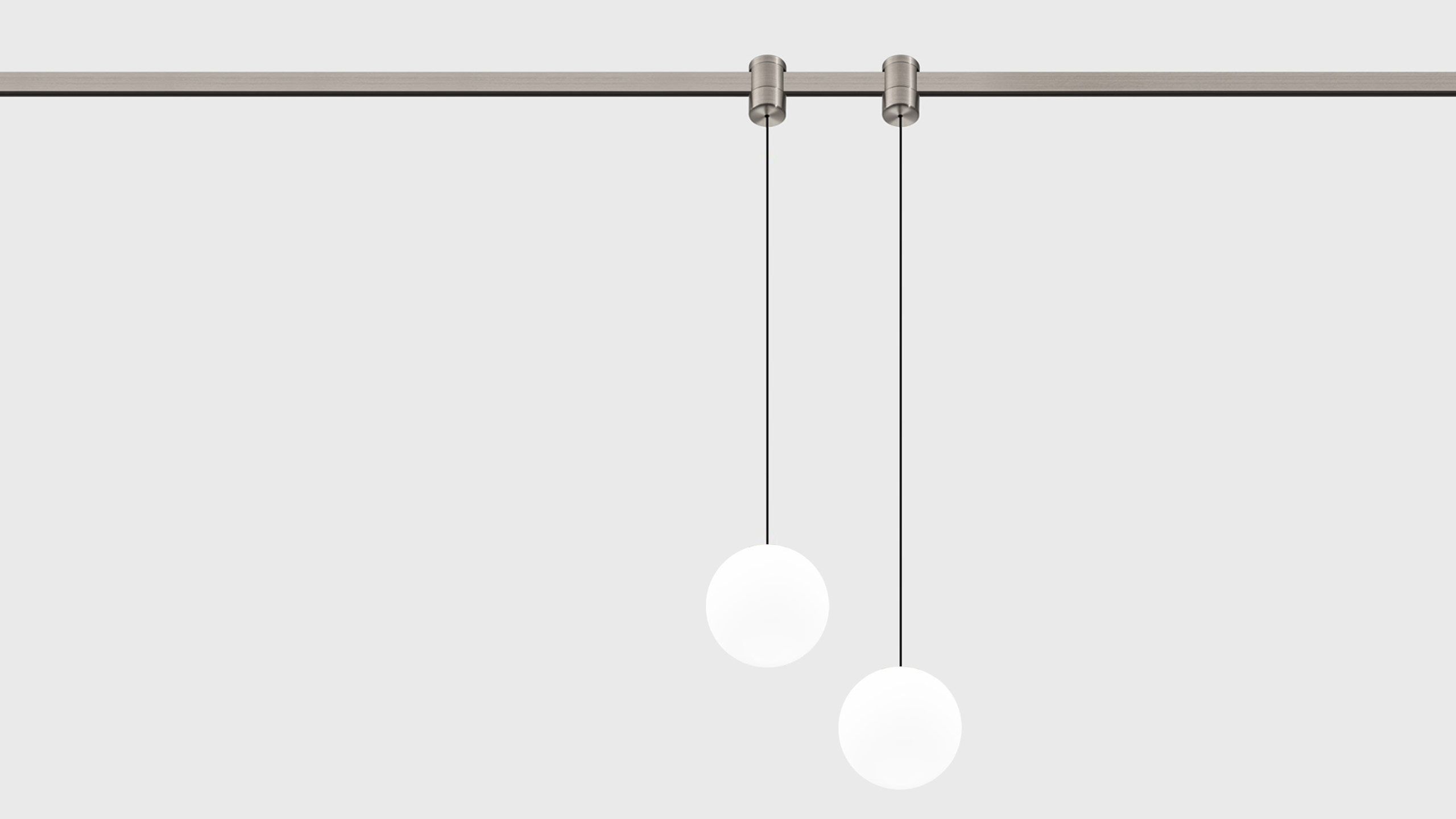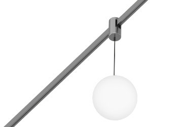 Pendant track luminaire with 100 mm diameter with a matte diffuser and a wide 280° beam angle for AUROOM lighting system.