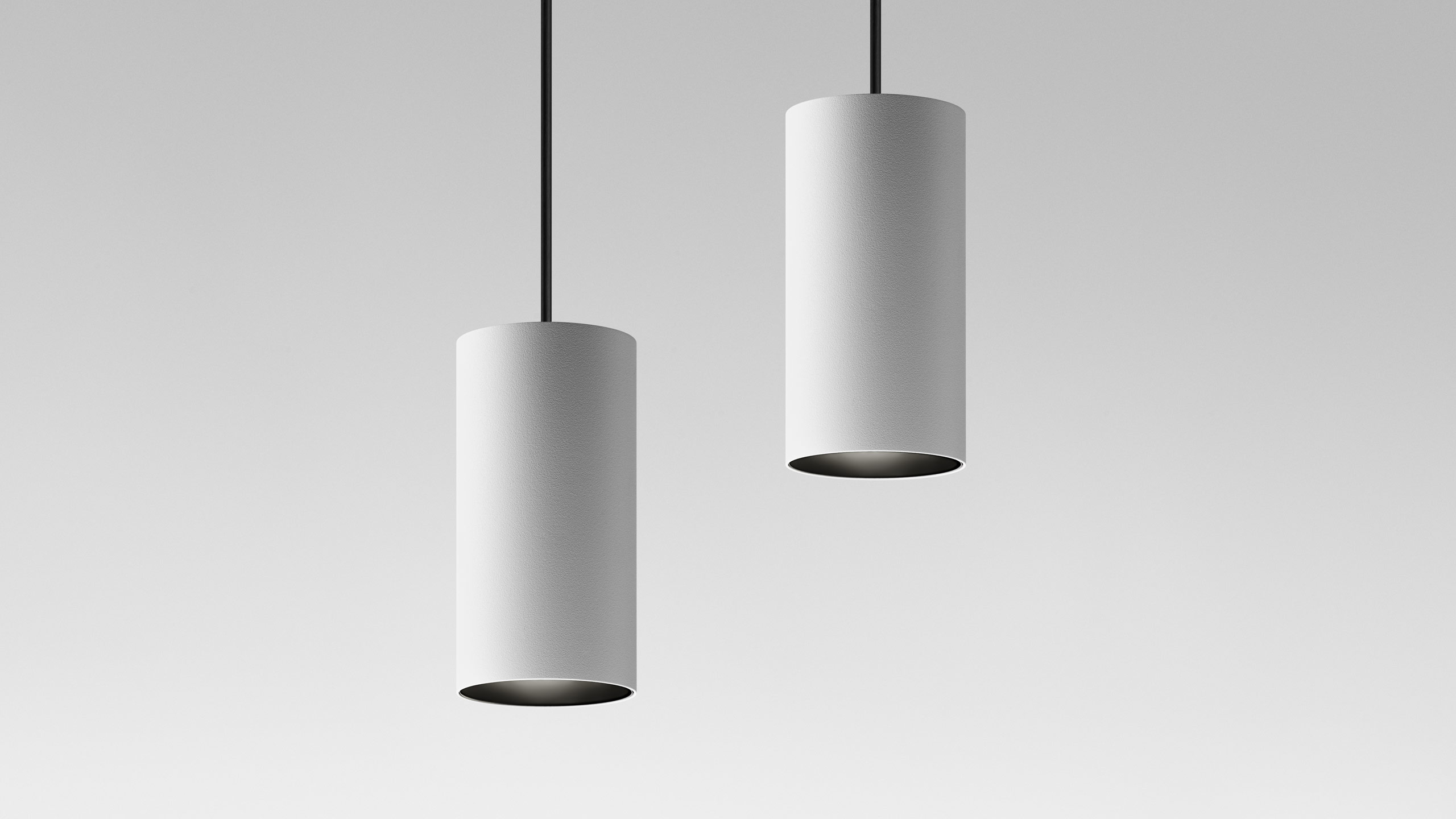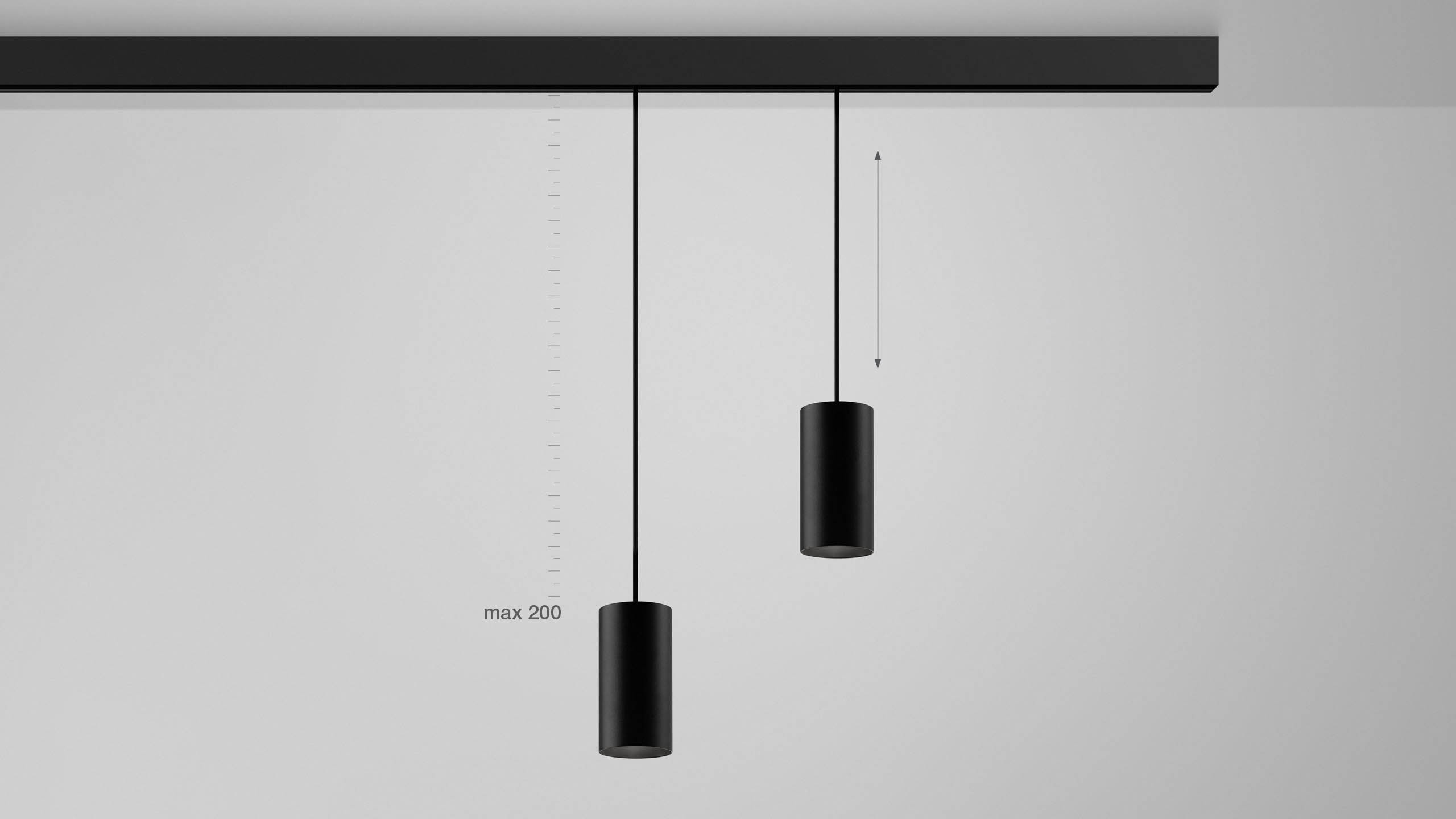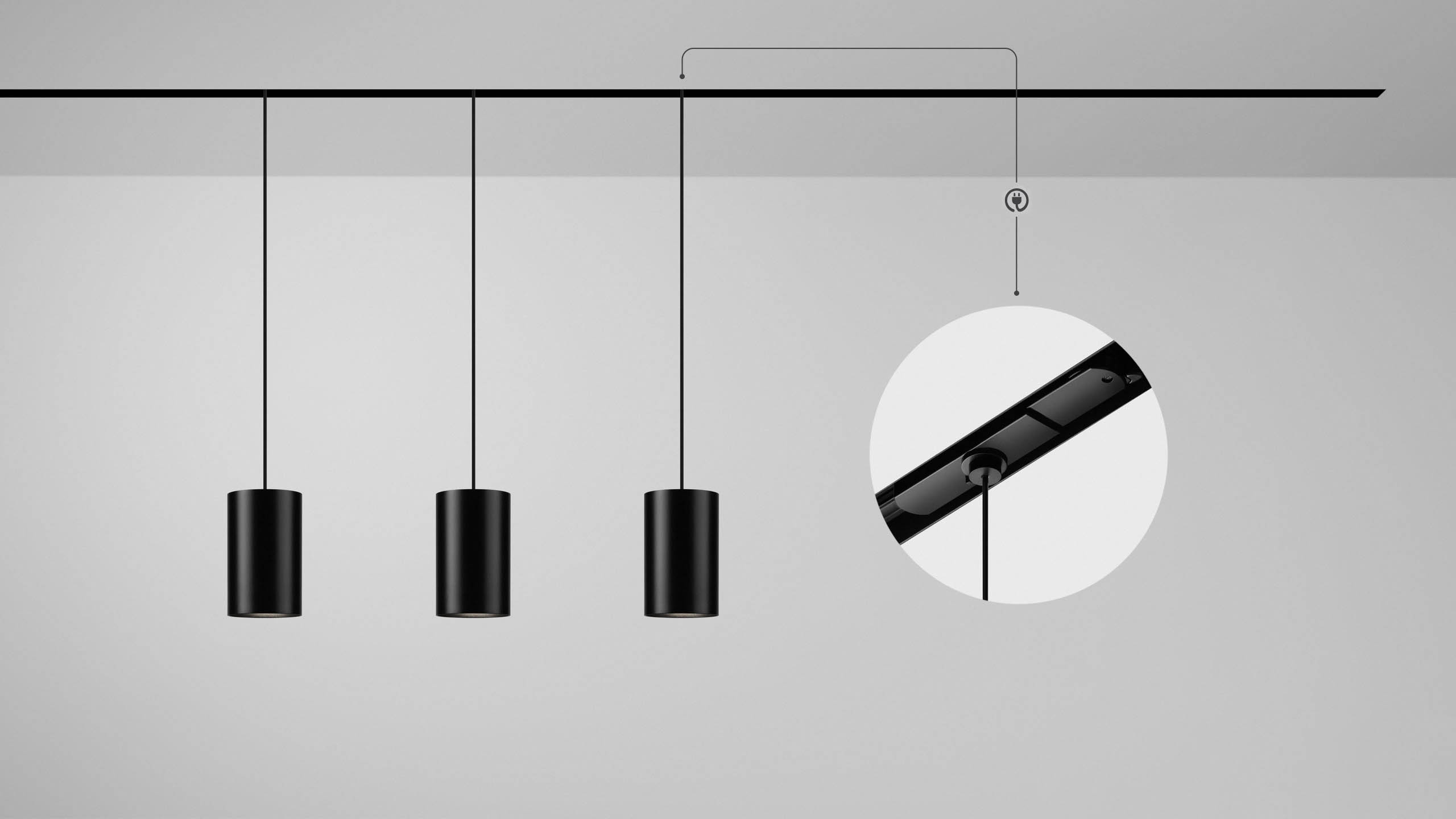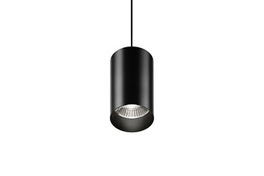Pendant track fixtures with cylindrical housings. Recessed light source provides high level of visual comfort and prevents glare.