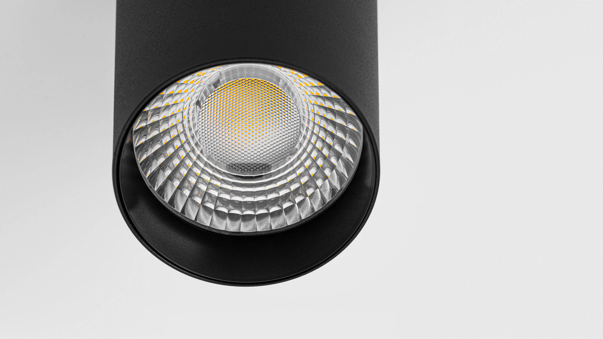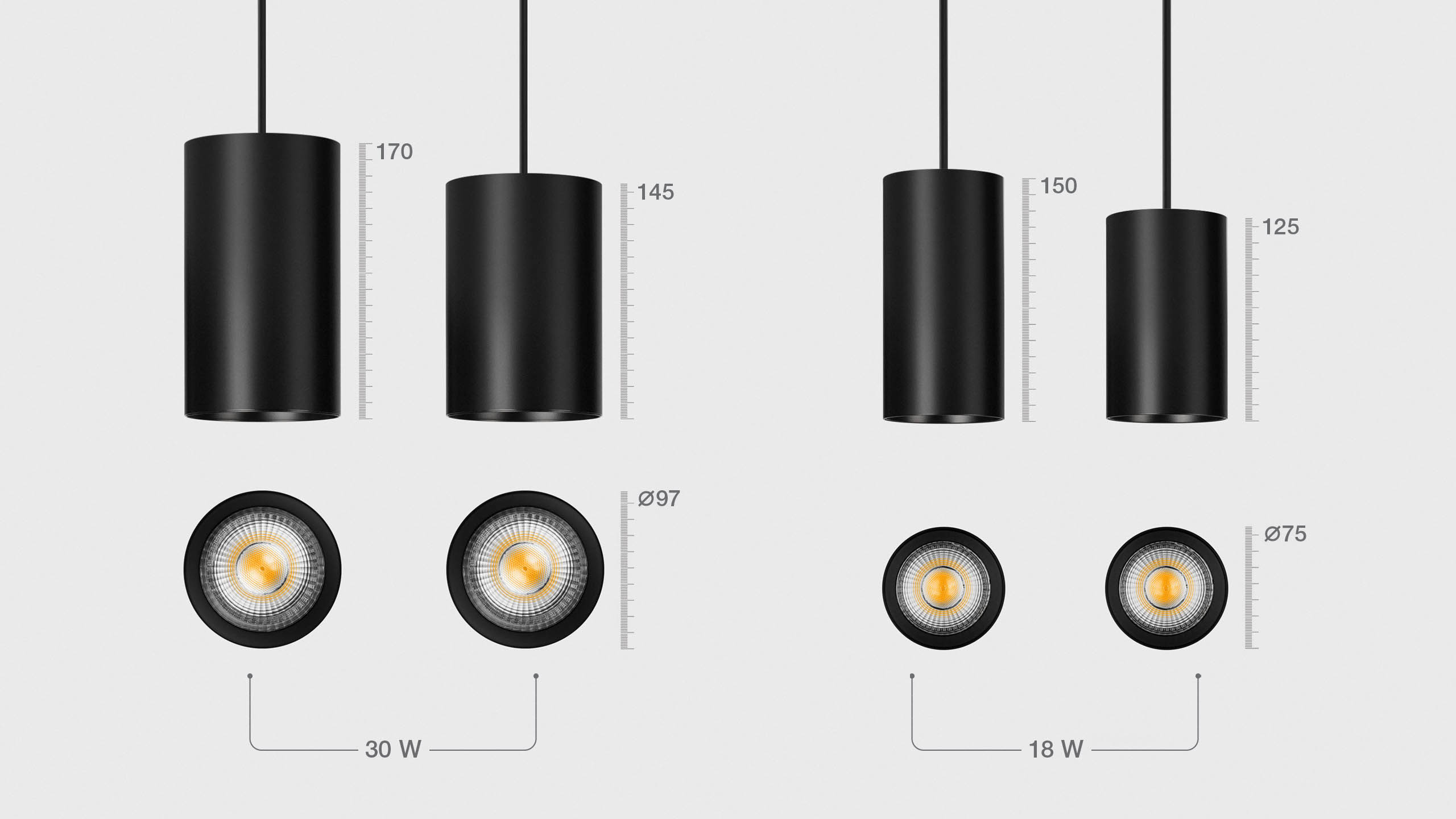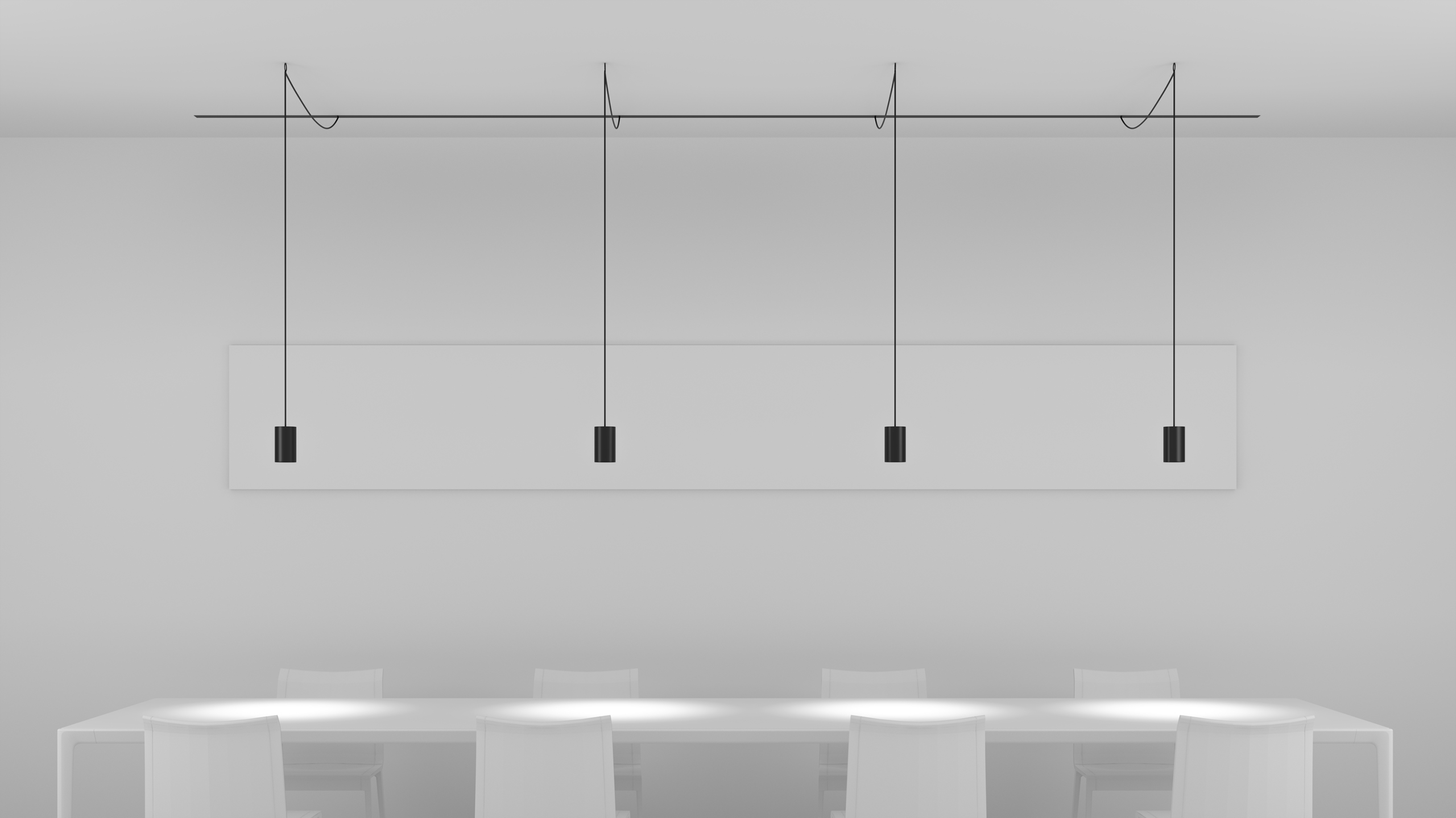Pendant track fixtures with cylindrical housings. Recessed light source provides high level of visual comfort and prevents glare.