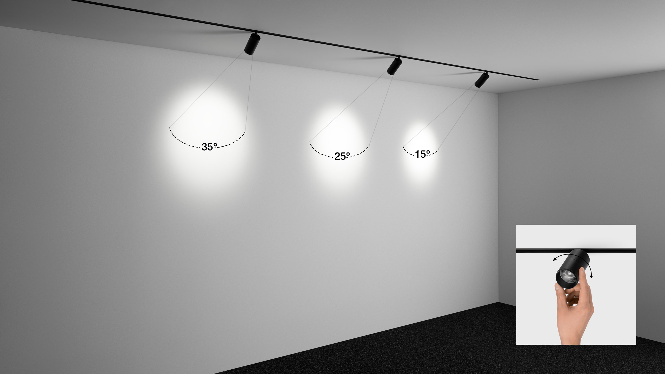 Track luminaire is equipped with a special Optic Zoom lens. Just jut the lens out to make the light beam narrow. Ultra-powerful light flux.