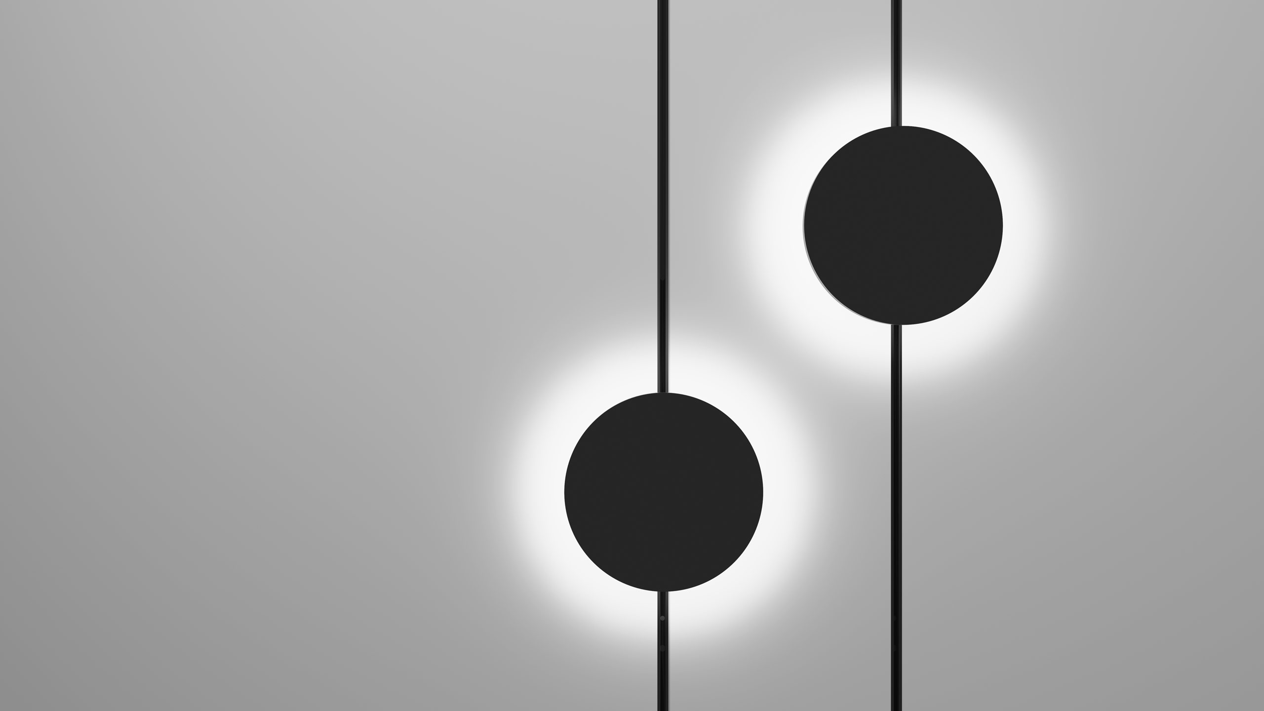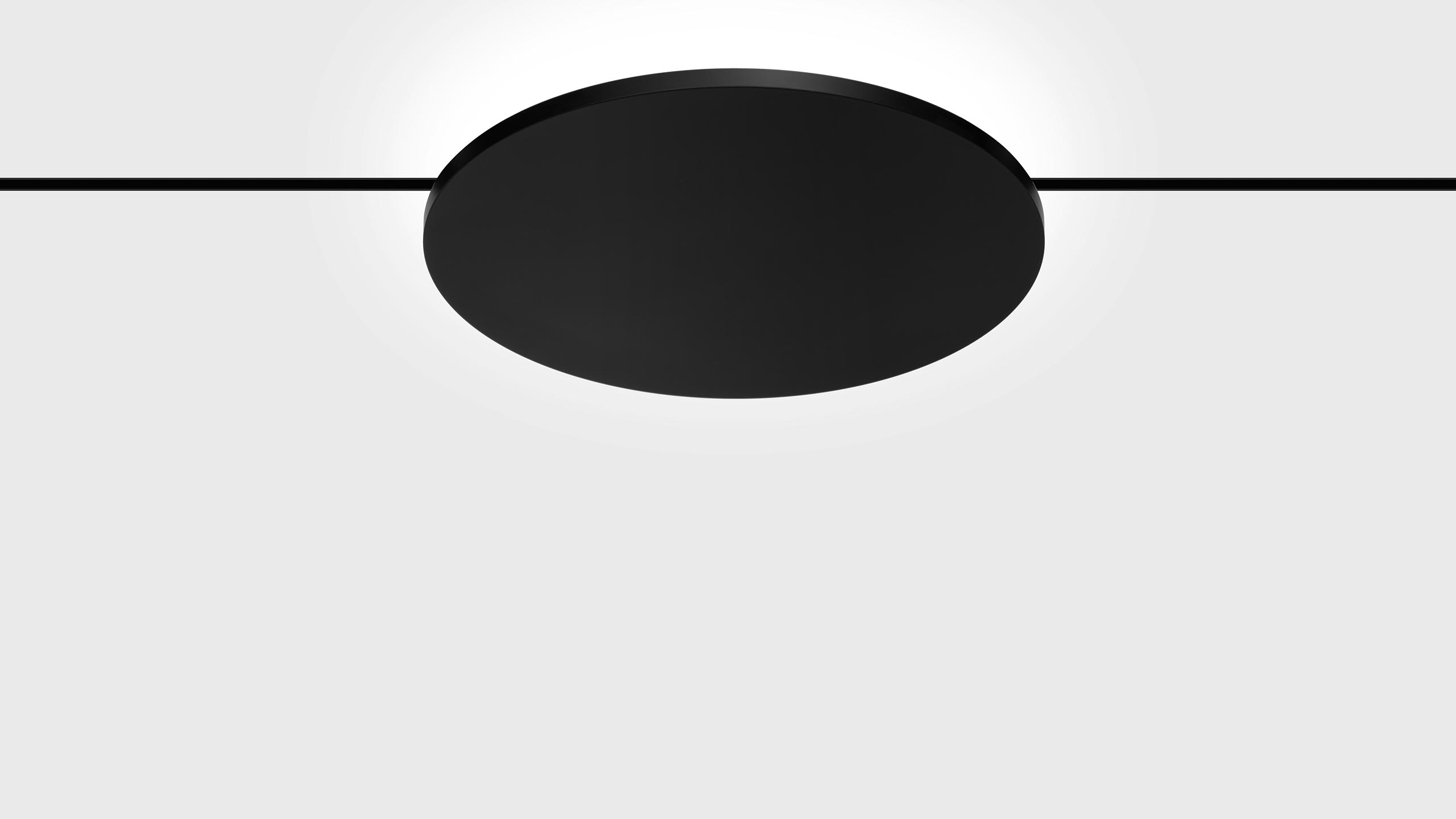 Decorative track luminaire shaped like a disc, produces reflected light.